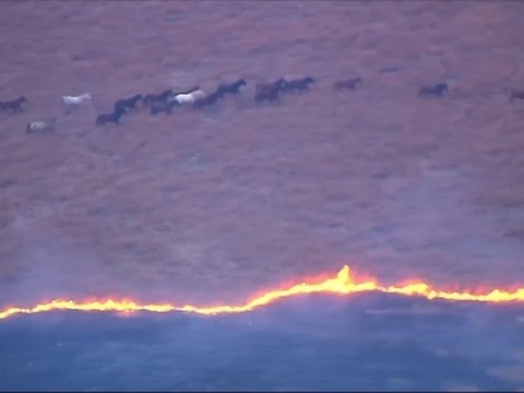 Aerial video shows a pack of wild horses running to escape a large grass fire in Oklahoma, USA last Monday.